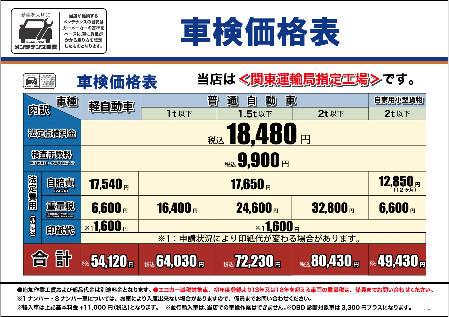 • 輸入車は車検基本点検整備料に、10,000円(税込11,000円)プラスとなります。